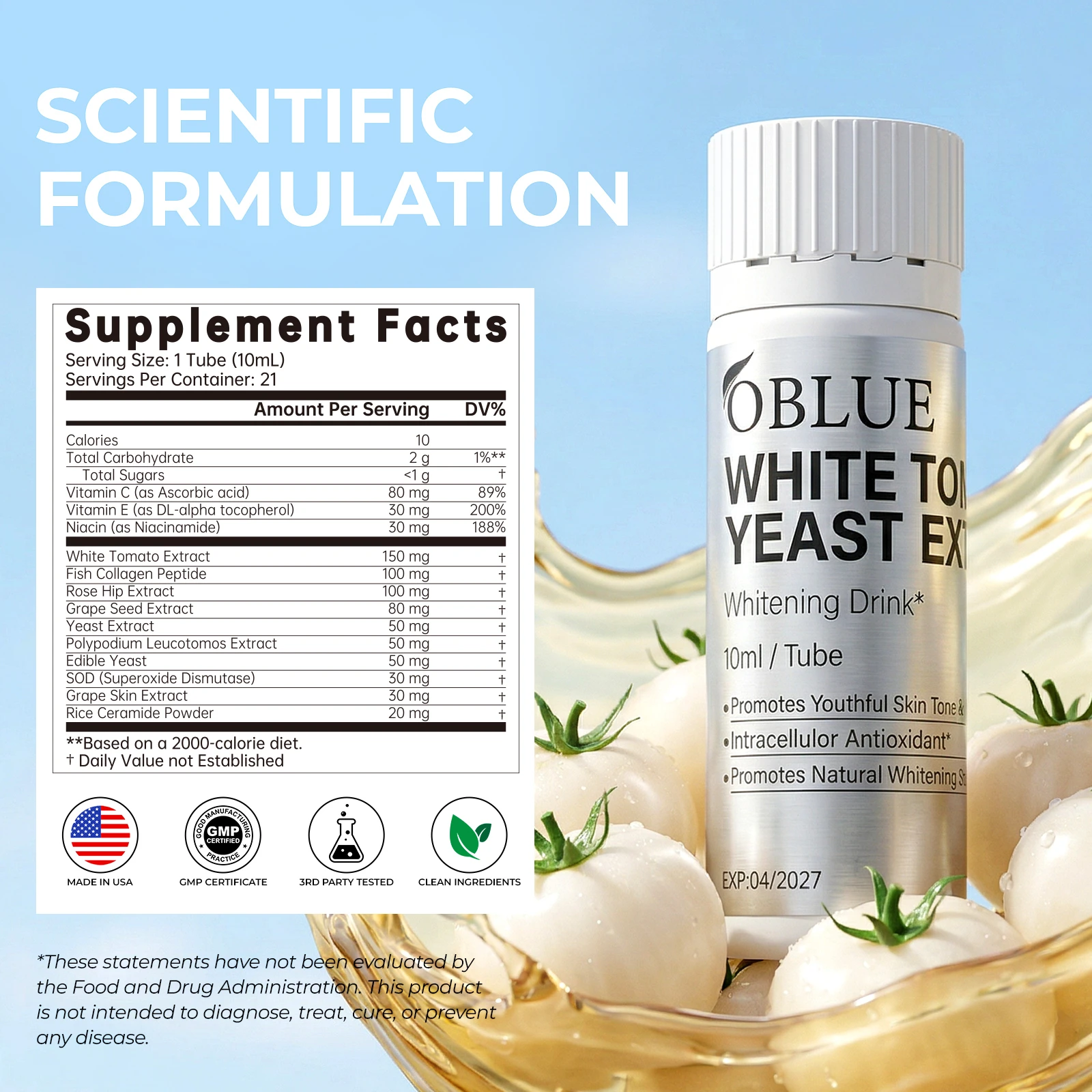 It enhances the concentrated content of white tomato extract, effectively restores skin brightness and whiteness, and conditions the skin through a dual-mechanism approach.